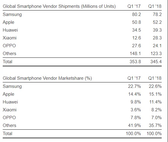 На втором и третьем местах надежно закрепились Apple и Huawei. Компании отгрузили по 52.2 (15.1%) и 39.3 (11.4%) млн аппаратов соответственно. В сумме за первый квартал 2018 года на мировой рынок смартфонов поставлено 345.4 млн устройств.