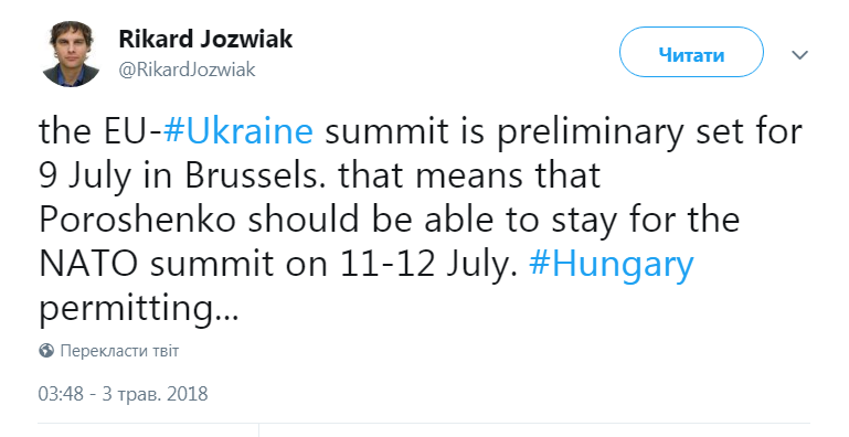 "Саммит Украина-ЕС предварительно назначен на 9 июля в Брюсселе", - сообщил Йозвяк. Журналист пошутил по поводу того, что саммит не был заблокирован венгерской стороной. Как известно, на самом деле страны-члены не могут блокировать проведение таких мероприятий по линии ЕС.