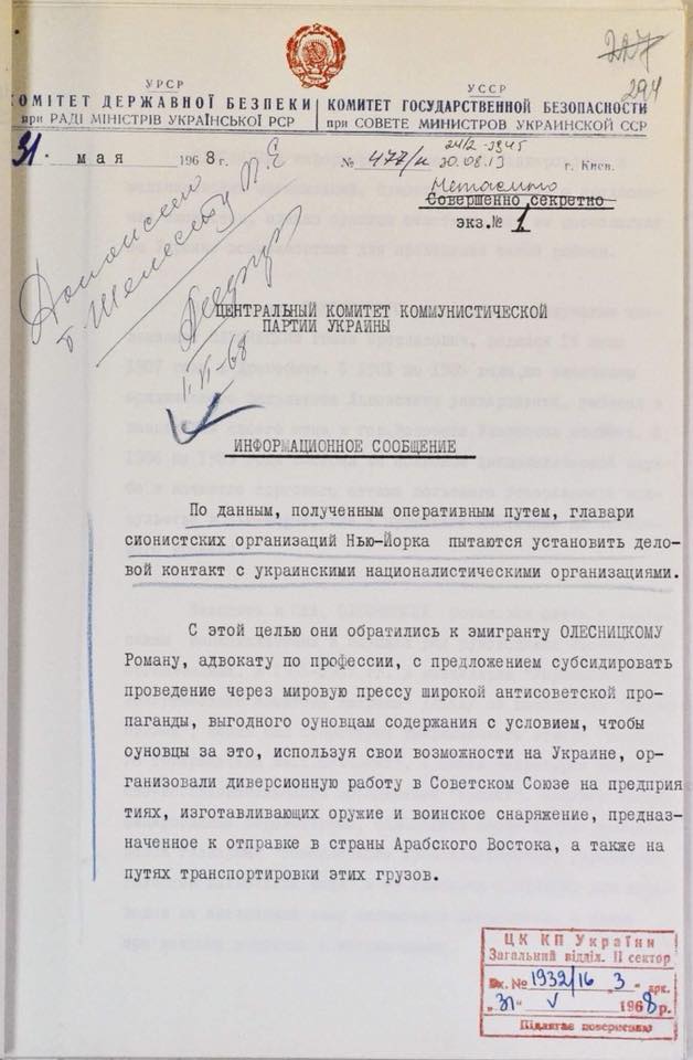 Так, согласно материалу 1968 года, некие "главари сионистских организаций Нью-Йорка" планировали позитивно осветить деятельность Организации украинских националистов (ОУН) в "мировой прессе".