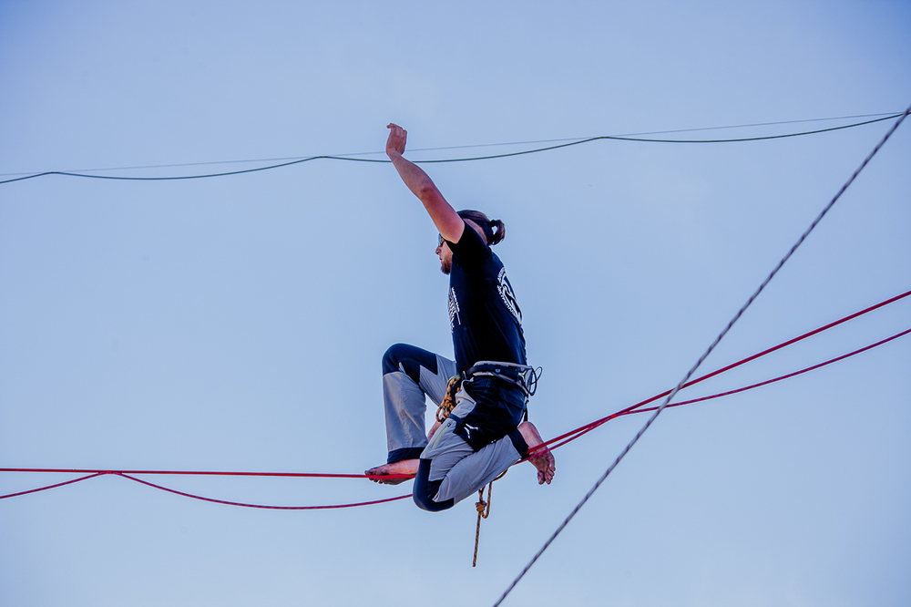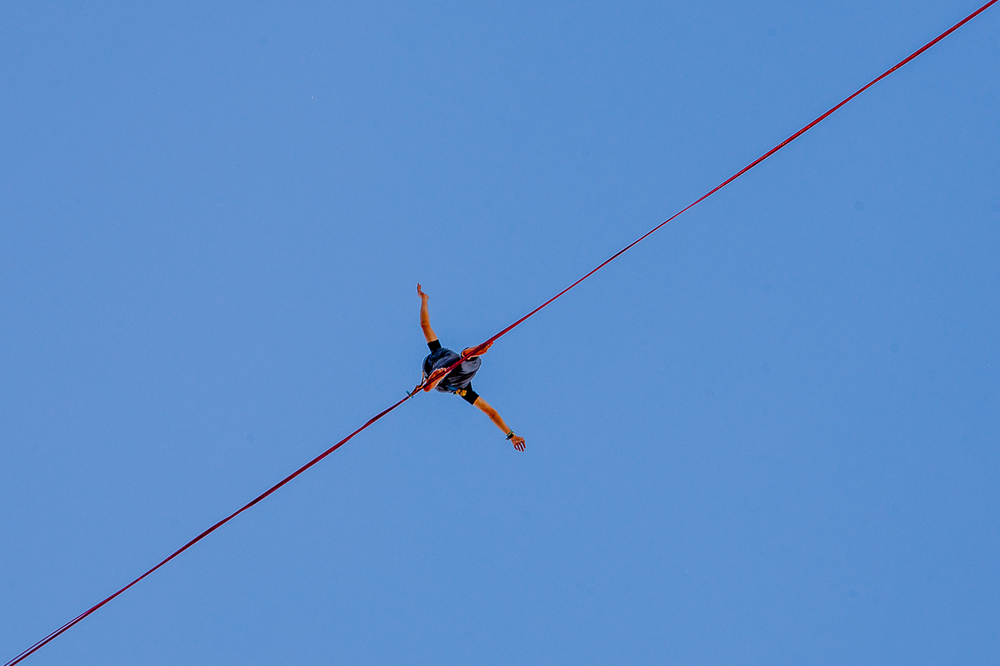 Отметим, что хайлайн — это хождение по высоко натянутой стропе, самое экстремальное направление популярного молодежного вида спорта слэклайна. Спортсмен выходит на стропу со страховкой.
