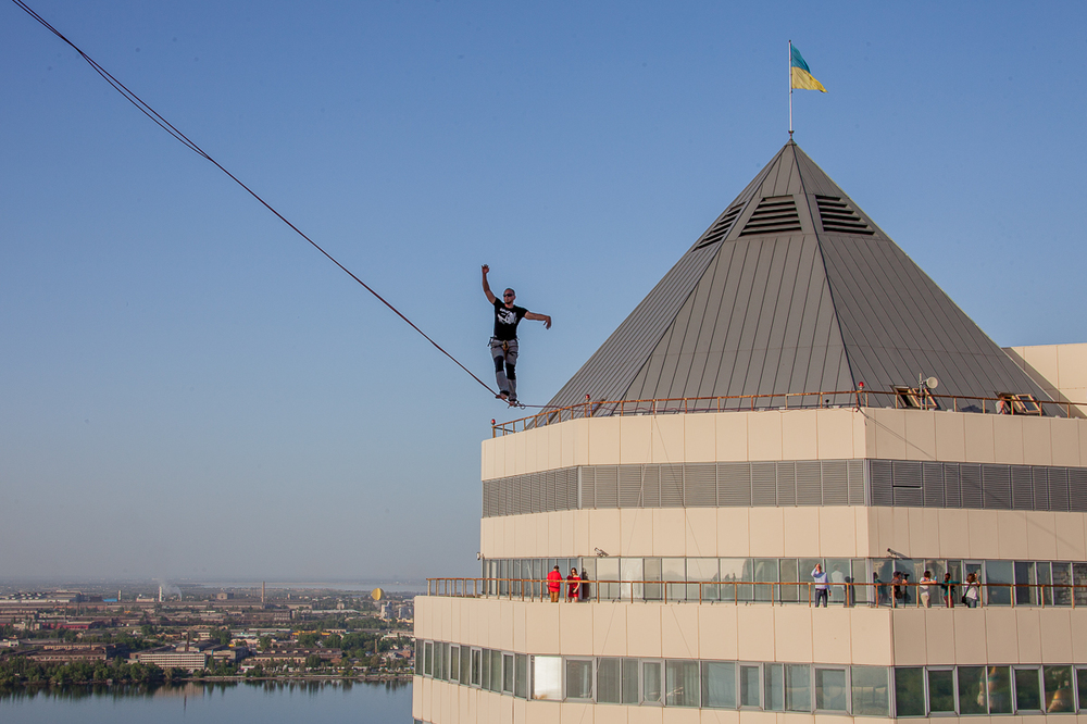В прошлом году днепровские экстремалы покорили 88-метровую высоту, натянув стропу между крышами 26-этажных зданий. В этом году рекорд превысил предыдущий на 6 метров.