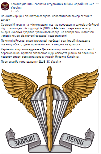 "Во время проведения мероприятий по боевой подготовке одного из подразделений ДШВ у 44-летнего сержанта запаса Андрея Яковлевича Куприяна остановилось сердце", - говорится в сообщении.