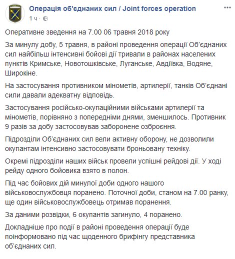 По данным разведки, в течение суток шесть боевиков погибли, четыре ранены. В ходе одного из рейдов украинских военных был взят в плен боевик.