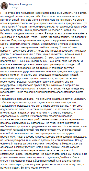 "Гражданские, возомнившие, что они могут решать за других, указывать тебе, как надо, как жить, куда ходить, что носить - это страшно. Гражданские, решившие, что они в праве все это делать, и при этом поддержанные властью - страшней вдойне. Не потому, что они такие плохие люди - казаки. А просто потому, что мир им неведом, и образование их - школа. Их авторитеты говорят им простые, укладывающиеся в их неразработанные головы слова о героическом прошлом и примитивном настоящем", - пишет она в Facebook.