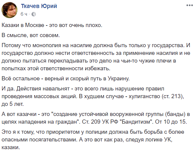 Это я к тому, что приоритетом у полиции должна быть борьба с более опасными посягательствами. А это вот как раз, следуя логике УК, казаки", - пишет одесский журналист Юрий Ткачев.