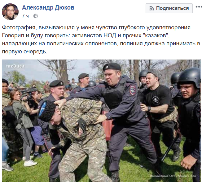 "Фотография, вызывающая у меня чувство глубокого удовлетворения. Говорил и буду говорить: активистов НОД и прочих "казаков", нападающих на политических оппонентов, полиция должна принимать в первую очередь", - написал он.