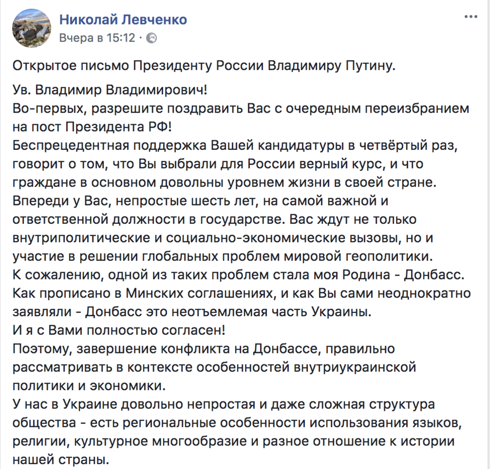 Экс-нардеп Николай Левченко призвал Путина отдать "ЛДНР" Украине