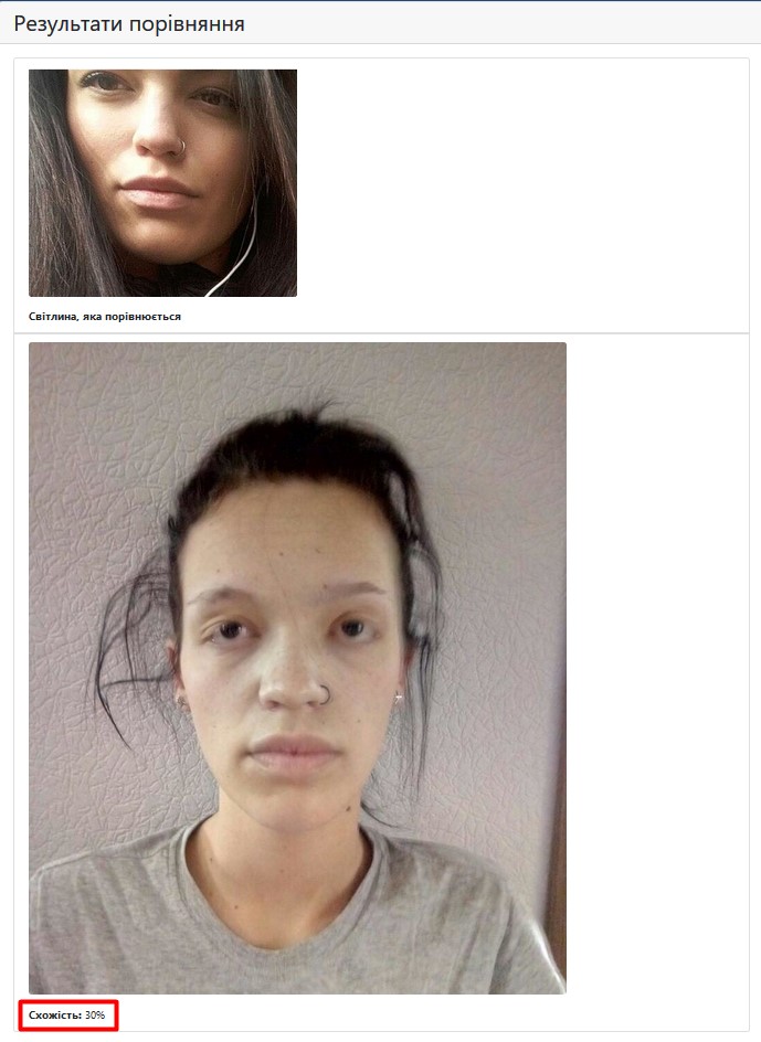 Фотосравнение снимков Лапинской в системе распознавания лиц "Миротворца" показало совпадение на 30%.