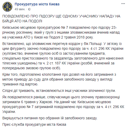 "Установлено, что злоумышленник пересек границу в сторону Польши. В связи с этим фигуранту заочно сообщено о подозрении по ч. 4 ст. 296 УК Украины (хулиганство, совершенное группой лиц с применением предмета, специально приспособленного и заранее заготовленного для нанесения телесных повреждений) и ч. 2 ст. 187 УК Украины (разбой, совершенный по предварительному сговору группой лиц)", - указано в опубликованном сообщении.