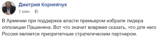 13:15  "В Армении при поддержке власти премьером избрали лидера оппозиции Пашиняна. Вот что значит вовремя сказать, что для него Россия является приоритетным стратегическим партнером", - реагирует на происходящее политолог Дмитрий Корнейчук.