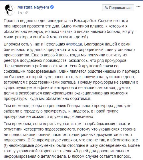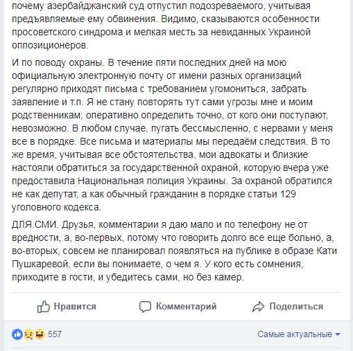 "Если верить журналистам, азербайджанские власти отпустили четвертого подозреваемого, потому что украинская сторона не предоставили полный пакет экстрадиционных документов и текст подозрения. В Генпрокуратуре уверяют, что это не так, и абсолютно все (!) необходимые документы были отосланы в Баку своевременно. Более того, у украинской стороны есть еще 40 дней для дополнительного информирования о деталях дела", - написал палраментарий.