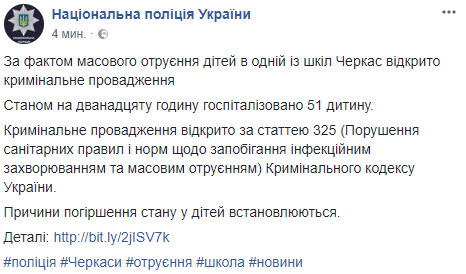 По факту массового отравления детей в одной из школ Черкасс открыто уголовное производство.