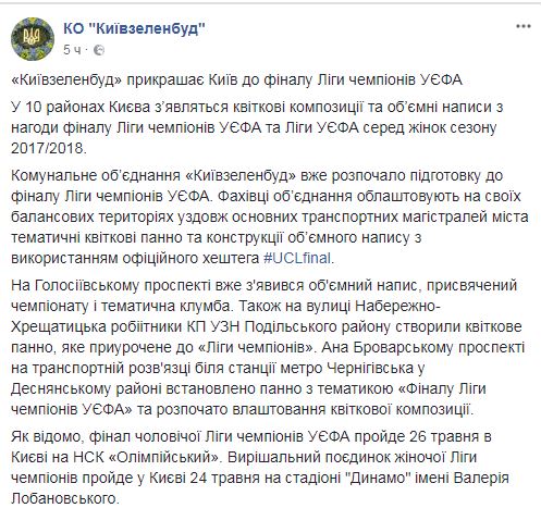 В частности, на Голосеевском проспекте уже появилась объемная надпись, посвященная чемпионату, и тематическая клумба. Также на улице Набережно-Крещатицкая создали цветочное панно, которое приурочено к финалу ЛЧ.