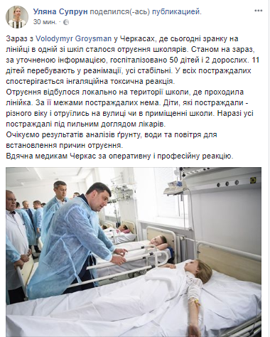 Исполняющая обязанности министра здавоохранения Ульяна Супрун, которая экстренно вылетела вместе с премьер-министром Украины Владимиром Гройсманом в Черкассы, рассказала о состоянии здоровья 50 школьников и 2 учителей, госпитализированных в больницу с подозрением на отравление неизвестным веществом.