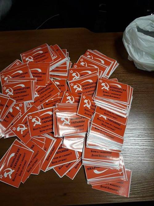 Ранее в этот день сотрудники СБУ провели обыски у руководителей компартии в Киеве и Киевской области, во время которых обнаружены агитационные материалы с запрещенной символикой коммунистического тоталитарного режима. Во время обысков правоохранители обнаружили агитационные материалы с запрещенной символикой коммунистического тоталитарного режима, которые планировалось по заказу российских кураторов распространять 9 мая с целью дестабилизации общественно-политической обстановки в Украине и провоцирования силовых столкновений между активистами общественно-политических объединений.