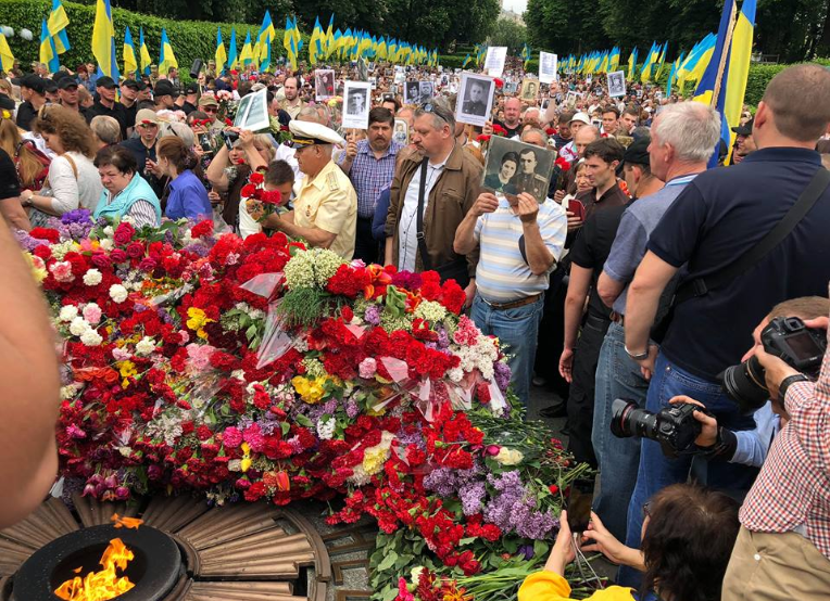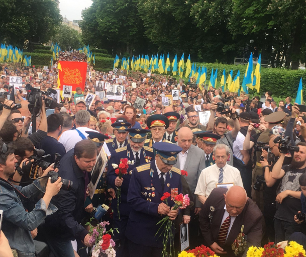 По Киеву 9 мая прошел марш "Бессмертный полк", который стартовал у метро Арсенальная и дошел к Парку Вечной славы, чтобы возложить цветы к Вечному огню.
