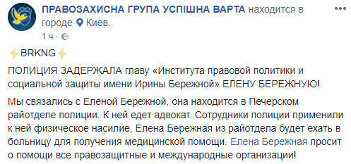 Мы связались с Еленой Бережной, она находится в Печерском райотделе полиции. К ней едет адвокат. Сотрудники полиции применили к ней физическое насилие, Елена Бережная из райотдела будет ехать в больницу для получения медицинской помощи. Елена Бережная просит о помощи все правозащитные и международные организации!