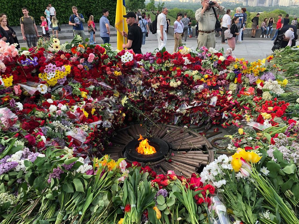 Сегодня, 9 мая, когда Украина отмечает День Победы, у Вечного огня в Киеве собралось огромное количество цветов, которые люди принесли в память о героях.