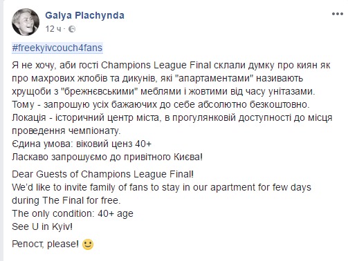 "Я не хочу, чтобы гости Champions League Final составили мнение о киевлян как о махровых жлобов и дикарей, которые "апартаментами" называют трущобы с "брежневскими" мебелью и желтыми от времени унитазами. Поэтому - приглашаю всех желающих к себе совершенно бесплатно. Локация - исторический центр города, в прогулочной доступности к месту проведения чемпионата", - написала пользователь Facebook Галя Плачинда.