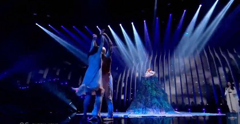 22.47 На сцене Iriao - этно-джаз коллектив из Грузии с медленной лирической песней "Sheni Gulistvis". Из спецэффектов - только дым по полу сцены.