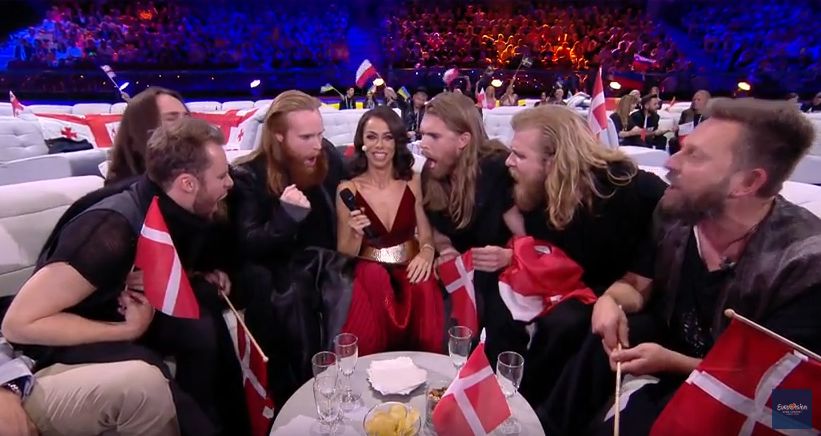 22.32 Также ведущая подержала норвежского конкурсанта Расмуссена за бороду и попросила его и его команду прокричать что-нибудь на датском в микрофон. Почле чего перевела их фразу так: "Мы любим милых котят".