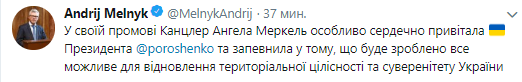 Посол Украины в Берлине Андрей Мельник заявил, что трехсторонние переговоры с участием Петра Порошенко, Ангелы Меркель и Эммануэля Макрона были успешными.