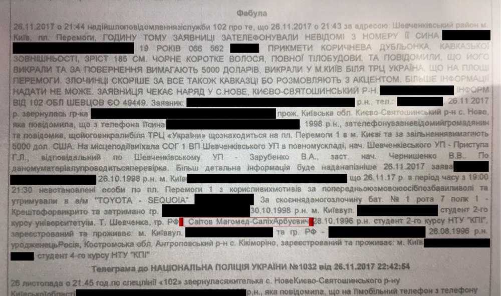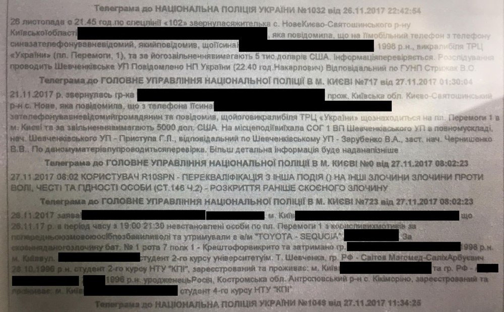 Похищение произошло еще 26 ноября (в одной из телеграмм указано 21 число, но это, скорее всего ошибка) 2017 года. В 21:45 женщина обратилась по линии "102" и заявила о том, что на ее телефон перезвонили с номера сына и сообщили о его похищении возле ТРЦ "Украина" (площадь Победы, 1) в Киеве. За его освобождение киднепперы потребовали 5000 долларов.
