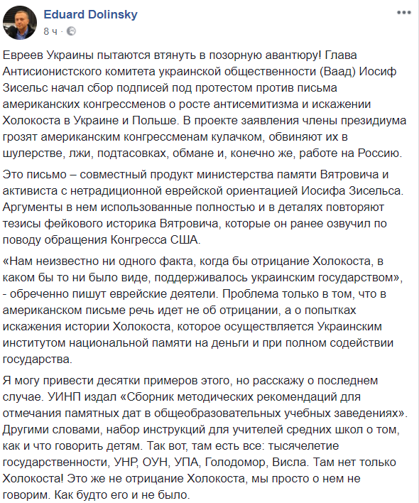 "УИНП (украинский институт национальной памяти Владимира Вятровича - ред.) издал "Сборник методических рекомендаций для отмечания памятных дат в общеобразовательных учебных заведениях". Другими словами, набор инструкций для учителей средних школ о том, как и что говорить детям. Так вот, там есть все: тысячелетие государственности, УНР, ОУН, УПА, Голодомор, Висла. Там нет только Холокоста! Это же не отрицание Холокоста, мы просто о нем не говорим. Как будто его и не было", - пишет глава ЕК.