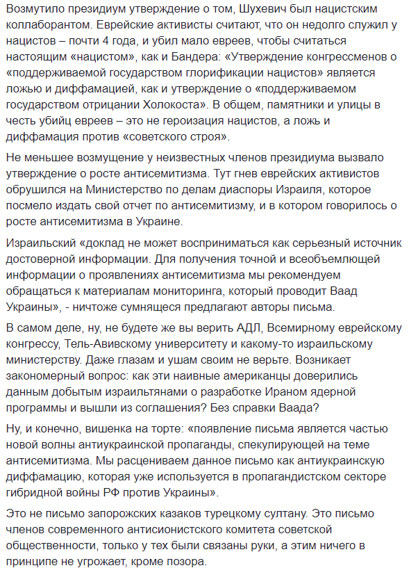 "Ну, и конечно, вишенка на торте: "появление письма является частью новой волны антиукраинской пропаганды, спекулирующей на теме антисемитизма. Мы расцениваем данное письмо как антиукраинскую диффамацию, которая уже используется в пропагандистском секторе гибридной войны РФ против Украины".