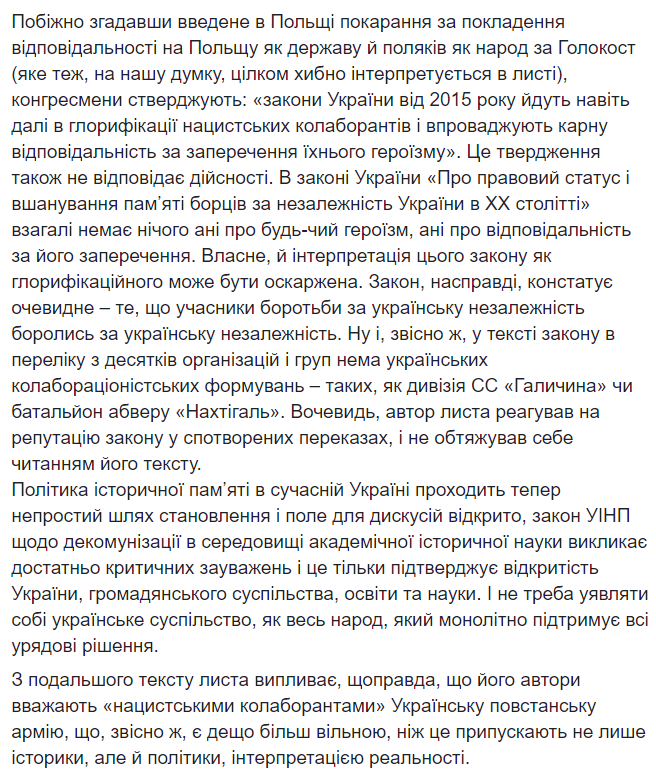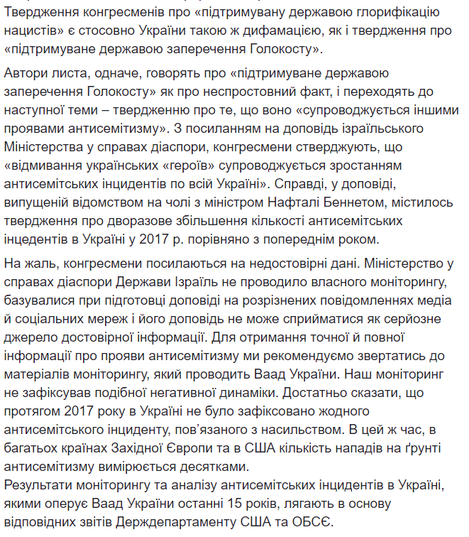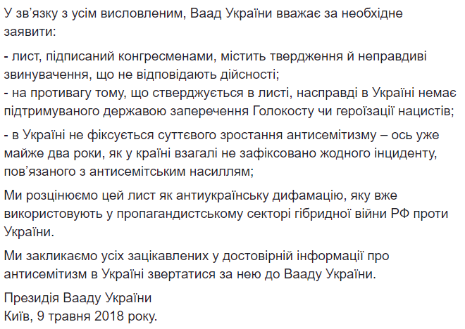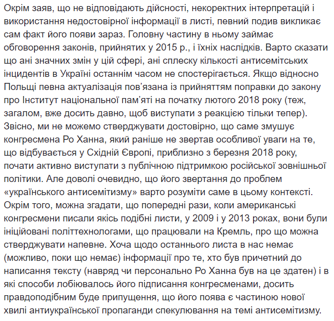 "В последнем случае письма у нас нет (возможно, пока нет) информации о том, кто был причастен к написанию текста (вряд ли персонально Ро Ханна был на это способен) ... Достаточно правдоподобным будет предположение, что его появление является частью новой волны антиукраинской пропаганды спекуляции на теме антисемитизма", - пишет глава ВААД.