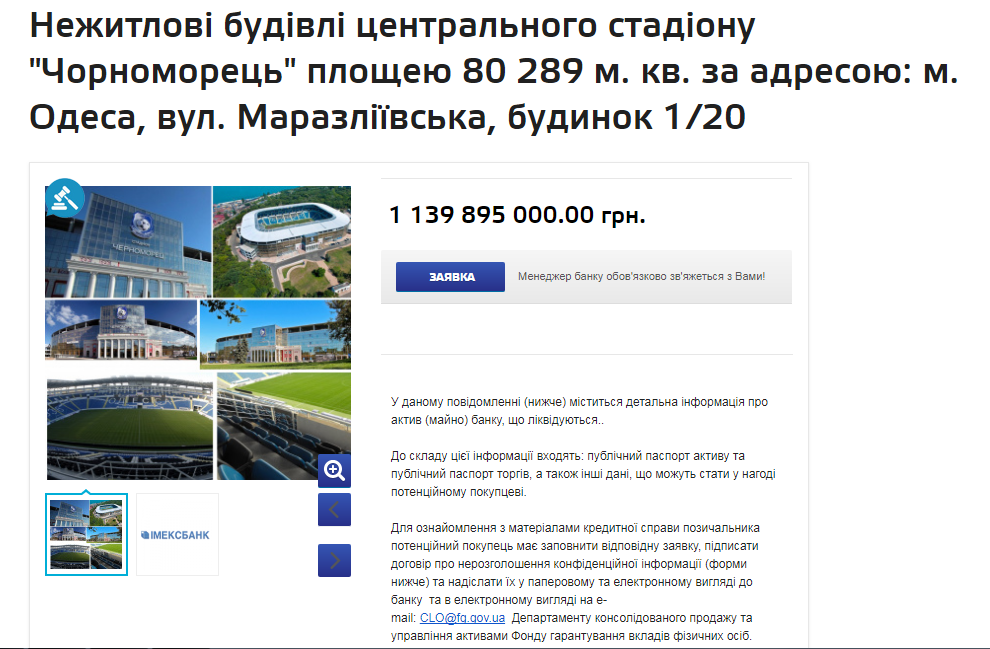 Одесский стадион "Черноморец" выставлен на аукцион в системе "ProZorro.Продажи" со стартовой ценой 1 млрд 139,9 млн грн. Торги ведутся от лица Фонда гарантирования вкладов физических лиц (ФГВФЛ).