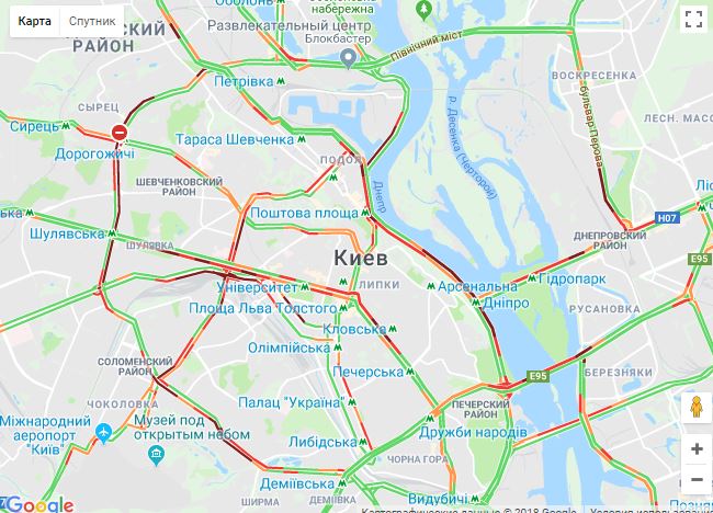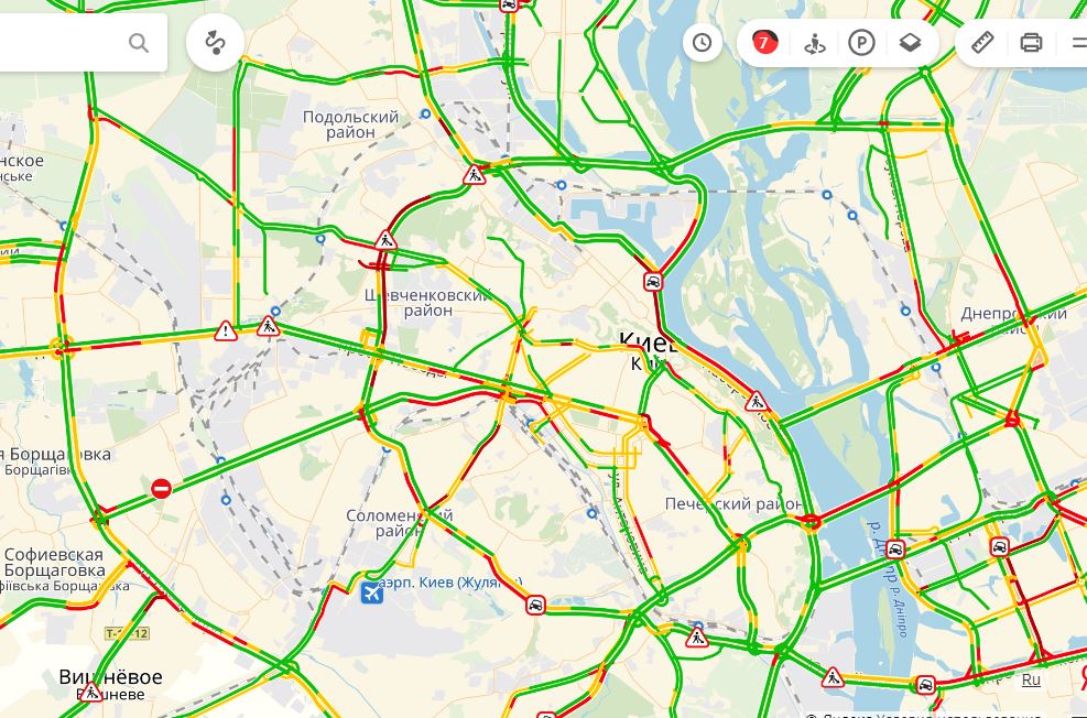 Сегодня, 11 мая, с утра пробки в Киеве достигли уровня 7 баллов при максимальной отметке в 10 баллов. Об этом сообщают сервисы Google Maps, а также Яндекс.Пробки.