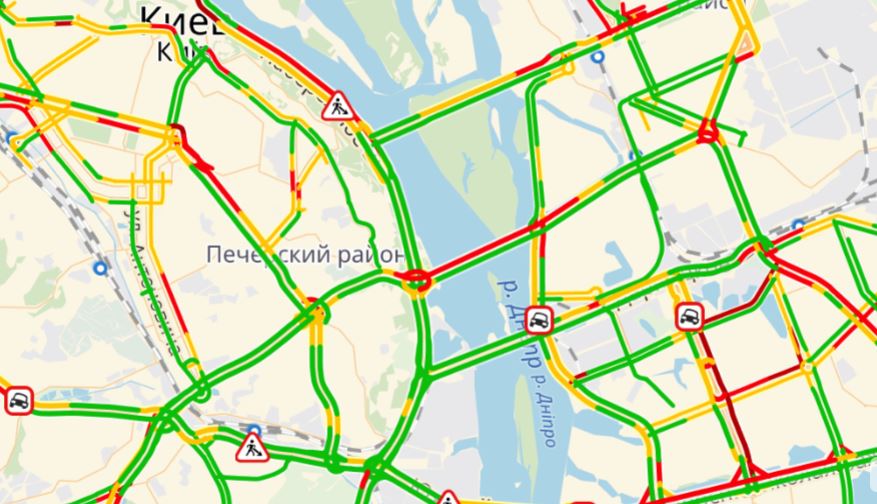 Самая большая пробка по состоянию на 9:15 наблюдается на улице Елены Телиги (м. Дорогожичи), а также на жилом массиве Подол, движение в которых составляет 5 км/ч,. Образовалась пробка из-за ремонтных работ.