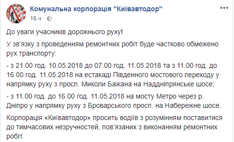 "Вниманию участников дорожного движения! В связи с проведением ремонтных работ будет частично ограничено движение транспорта с 11.00 до 16.00 11.05.2018 на мосту Метро через р. Днепр в направлении движения с Броварского просп. на Набережное шоссе", - говорится в сообщении.
