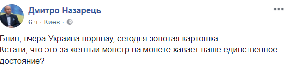 "Блин, вчера Украина порннау, сегодня золотая картошка. Кстати, что это за жёлтый монстр на монете хавает наше единственное достояние?", - пишет юрист Дмитрий Назарец.