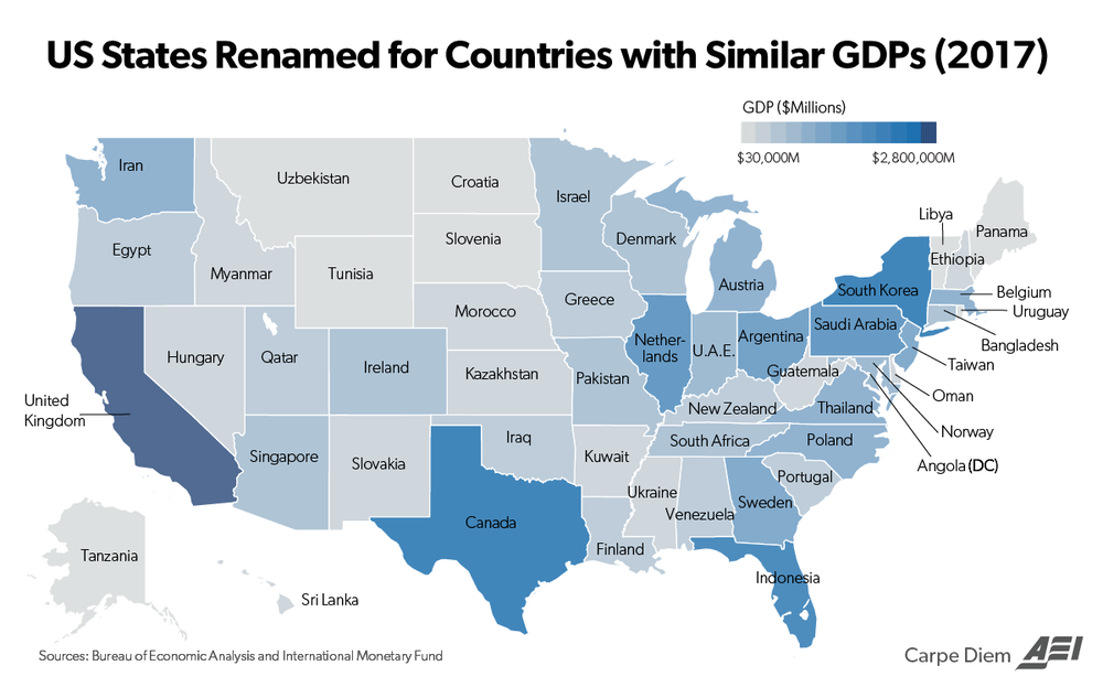Так, профессор экономики и финансов Университета Мичигана Марк Перри провел исследование, где сравнил ВВП американских штатов со странами мира.