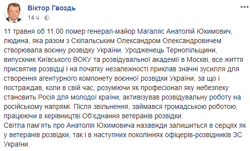 "Сегодня в 11.00 умер генерал-майор Магаляс Анатолий Ефимович, человек, который вместе с Скипальским Александром Александровичем создавал военную разведку Украины. Уроженец Тернопольщины, выпускник Киевского ВОКУ и разведывательной академии в Москве, всю жизнь посвятил разведке и в начале независимости приложил значительные усилия для создания агентурного компонента военной разведки Украины, за что и пострадал, когда в свое время, понимая как профессионал, какую опасность представляет Россия для молодой страны, активизировал разведывательную работу на российском направлении", — сообщил Гвоздь.