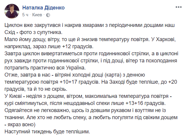 "Циклон уже закрутился и накрыл облаками с периодическими дождями наш Восток - фото со спутника", сообщает синоптик Наталья Диденко на своей странице в Facebook.