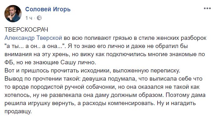 "Девушка подумала, что выписала себе что то вроде породистой ручной собачонки, но она оказался не такой как хотелось, ну не развлекала она даму должным образом. Поэтому дама решила игрушку вернуть, а расходы компенсировать. Ну и нагадить продавцу", – написал Соловей.