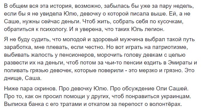 "Я не буду судить, что молодой и здоровый мужчина выбрал такой путь заработка, мне плевать, если честно. Но вот играть на патриотизме, выбивать жалость у пенсионеров, морочить голову девкам с целью развести их на деньги, чтоб потом за чьи-то пенсии ездить в Эмираты и поливать грязью девочек, которые поверили – это мерзко и грязно", – пишет Бучинская.