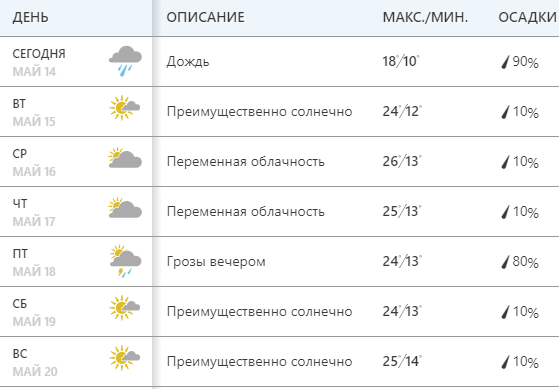 Сайт Weather.com сообщает, что дождь будет идти в понедельник, а вечером в пятницу возможна гроза. 14 мая днем +18, далее потеплеет до +24...+26.