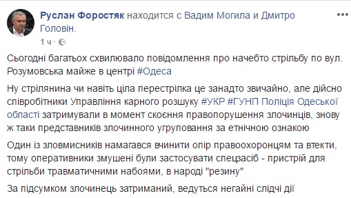 Как сообщил на своей странице в Facebook советник начальника Главного управления Нацполиции в Одесской области Руслан Форостяк, один из злоумышленников, которых задерживали в момент совершения правонарушения, попытался оказать сопротивление правоохранителям.