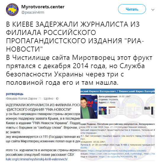 Задержанный руководитель "РИА Новости Украина" Кирилл Вышинский был внесен в раздел "Чистилище" сайта "Миротворец" за антиукраинскую пропаганду с 2014 года.