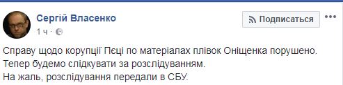 "Дело о коррупции Пети (президента Петра Порошенко - Прим. Ред.) по материалам пленок Онищенко возбуждено. Теперь будем следить за расследованием. К сожалению, расследование передали в СБУ", - написал Власенко.