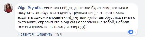 Ольга Прядко добавила: "Если так пойдет, дешевле будет скидываться и покупать автобус в складчину группам лиц, которым нужно ездить в одном направлении))) Ну или купил автобус, подъехал к остановке, спросил кто в одном направлении с тобой, набрал, все скинулись по пятерику и вперед)))."