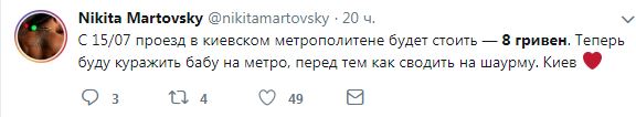 "После подорожания проезда в киевском метро с 0.16 до 0.25 евро - в вагонах начнут продавать элитный пластырь, а в переходах станут петь солисты национальной оперы!", - иронизирует logvynenko.