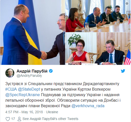 "Встретился со специальным представителем Госдепартамента США по вопросам Украины Куртом Волкером. Поблагодарил за поддержку Украины и предоставление летального оборонительного оружия. Обсудили ситуацию на Донбассе и законодательные планы Верховной Рады", - написал Парубий в Twitter.