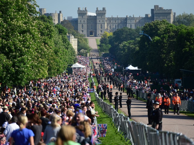 С самого утра площадь перед Виндзорским замком переполнена людьми. Многие приехали за несколько дней до важного события, чтобы занять самые удобные места прямо у ограждений вдоль пути следования свадебного кортежа, откуда можно получше рассмотреть проезжающих молодоженов.