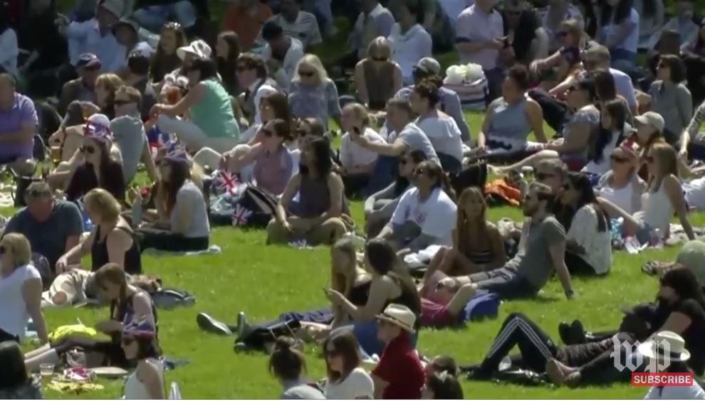 Тысячи туристов и местных жителей расположились на газонах в ожидании приезда невесты и жениха