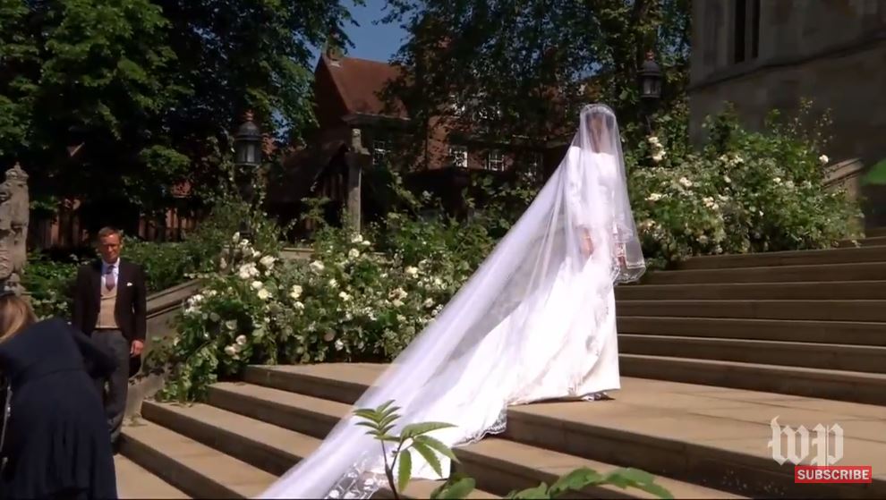 20:06 Свадебное платье было пошито из двухслойного шелка с нижней юбкой из трехслойной органзы. На Меган была пятиметровая фата из белого шелка, закрывавшая лицо. На фате – цветочный узор, представляющий все 53 страны, входящие в Британское содружество наций.